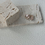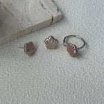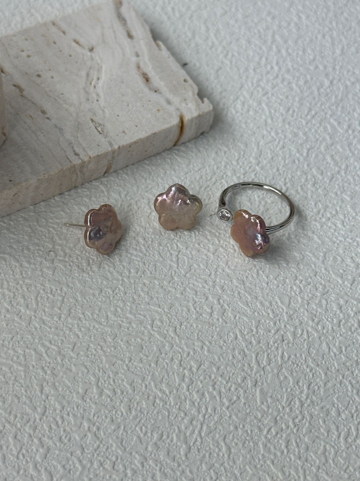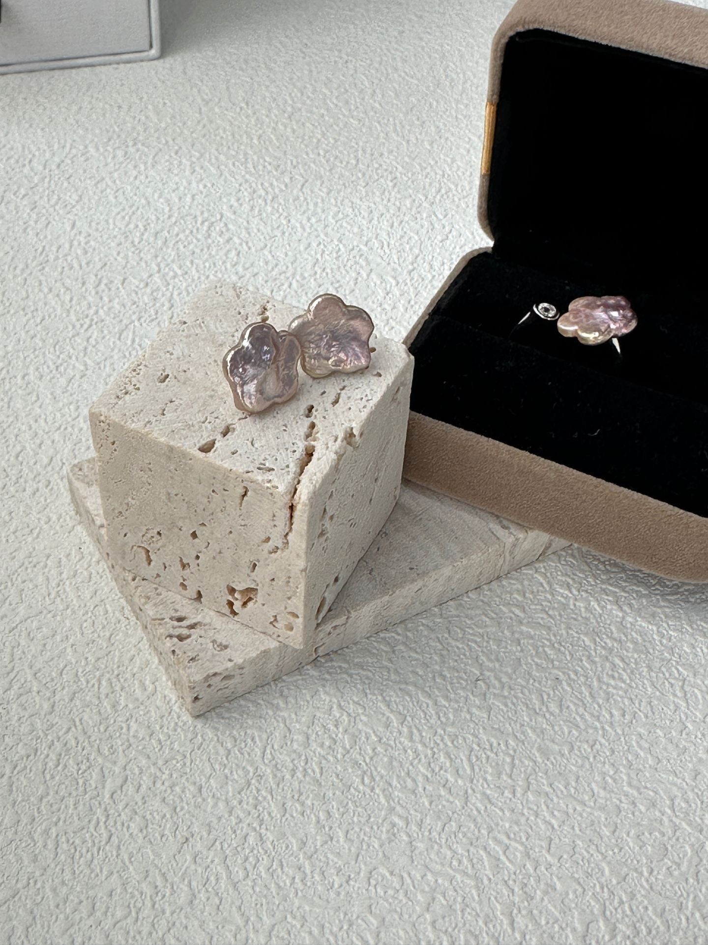 Pair of rose gold flower-shaped earrings and a matching ring on a light gray surface.