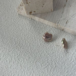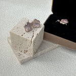 Heart-shaped earrings on a light gray surface with a white stone in the background