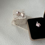 Pair of pink flower-shaped earrings on a white surface with a black card in the background.